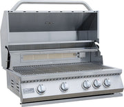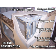 The grill and stainless steel access doors come pre-installed in the island for a clean, finished appearance. The island is constructed on a galvanized steel frame with a stucco base and porcelain tile countertop, offering durability and customization for outdoor environments.